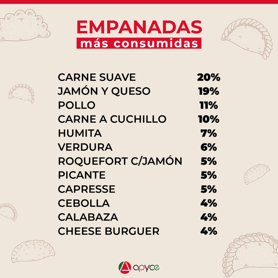 APYCE tienen sus elecciones bien marcadas. Las empanadas de "carne suave" se coronan en el primer lugar del podio con un 20% de preferencia, seguidas de cerca por las de "jamón y queso" en segundo lugar con un 19% (una mínima diferencia).