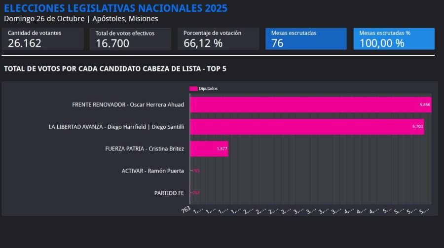 Con estos guarismos totales provisorios, da ganador al Frente Renovador Neo que tenía como cabeza de Lista al Presidente de la Cámara de Representantes de la provincia de Misiones, Dr. Oscar Herrera Ahuad, quien junto los demás Candidatos lograron 5.856 votos el 35,07% y el segundo más votados fue el ex tenista de la ciudad de Oberá, Diego Hartfield con 5.703 sufragios.