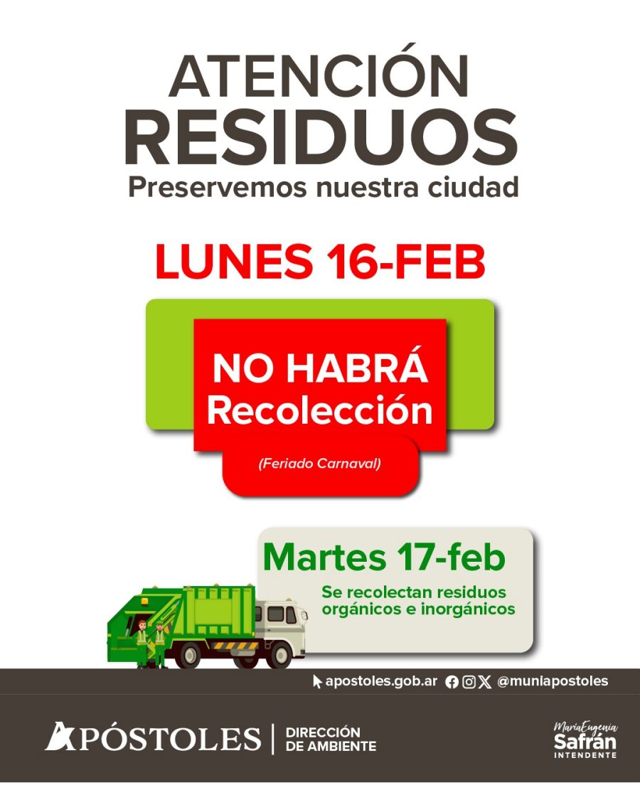 La Municipalidad de la ciudad misionera de Apóstoles informa que el próximo día lunes 16 de Febrero no se prestará el servicio de recolección de residuos domiciliarios, debido al feriado de Carnaval.
