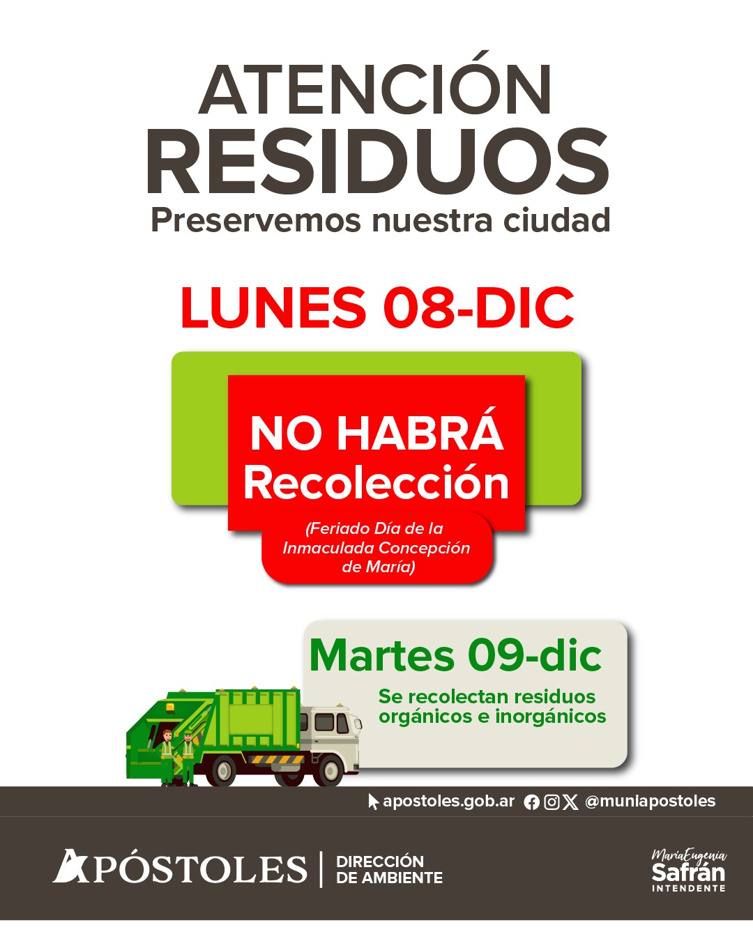 Apóstoles: El lunes no habrá recolección de residuos domiciliarios, feriado por la celebración de la Inmaculada Concepción de la Virgen María