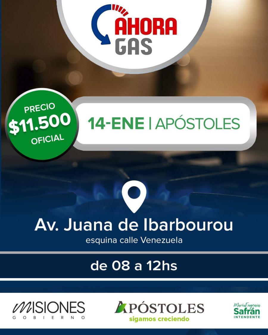 Apóstoles: El Programa Provincial “Ahora Gas”, el día 14 de Enero llega al Municipio, en esta oportunidad el lugar de venta será en Avenida Juana de Ibarbourou y calle Venezuela