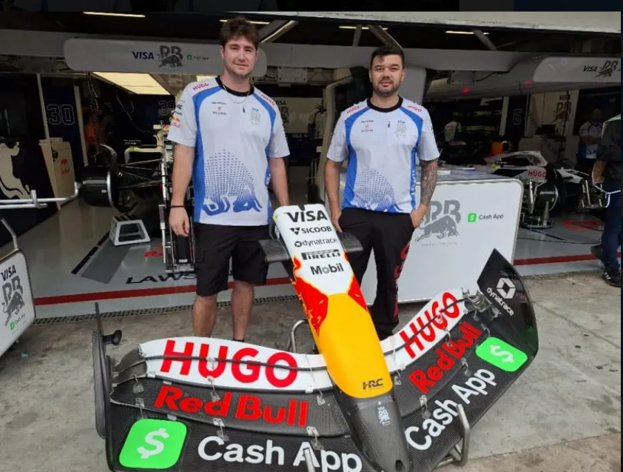 Los argentinos Gregorio Mandrini y Nicolás Bianco, en el último GP de Brasil, durante sus tareas en el equipo Racing Bulls. (Gentileza Darío Coronel/Infobae)