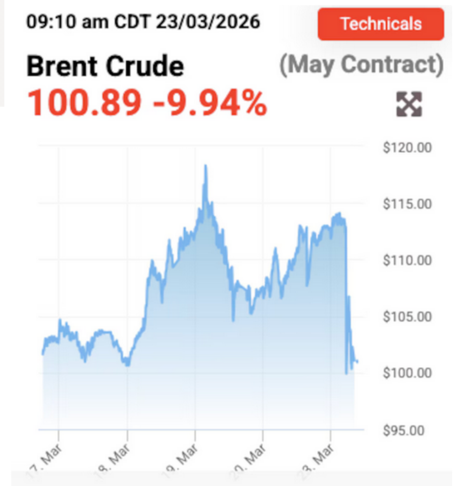 El anuncio del Presidente de los Estados Unidos (EE.UU.), Donald Trump, sobre una pausa en los ataques a las plantas de energía de Irán durante cinco días generó un caída de 10% en el precio internacional del petróleo crudo.