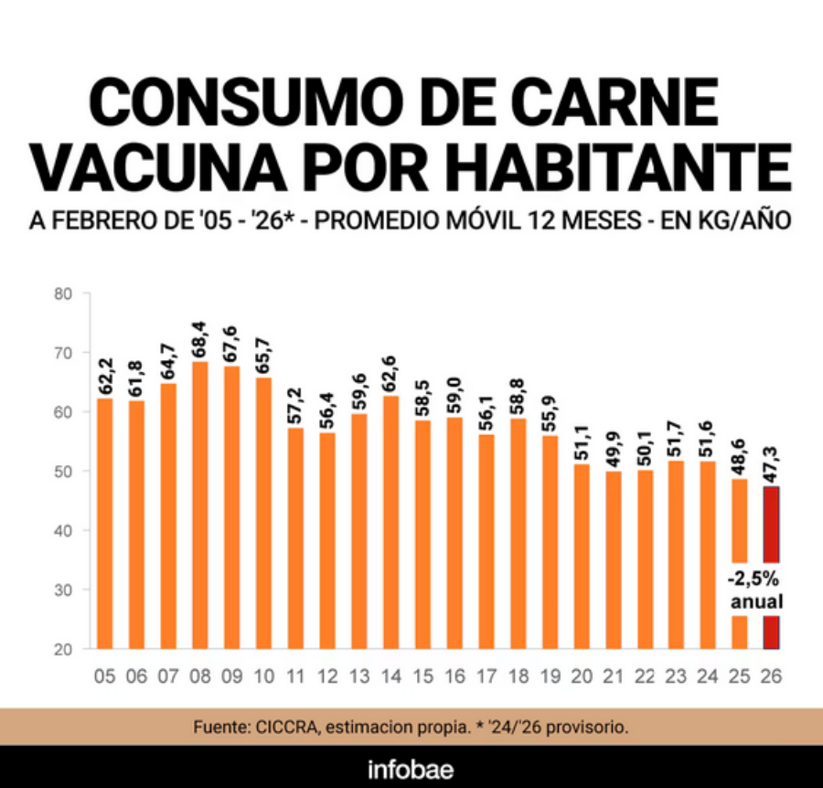 El dato se vuelve más relevante en un contexto de consumo en retroceso. Según la Cámara de la Industria y Comercio de Carnes y Derivados de la República Argentina, el consumo de carne vacuna cayó a 47,3 kilos por habitante en 2025, el nivel más bajo en dos décadas. En paralelo, el consumo se reconfiguró, de manera que crecieron tanto la participación del pollo y el cerdo, dos proteínas que funcionan como alternativas más accesibles a la carne vacuna.