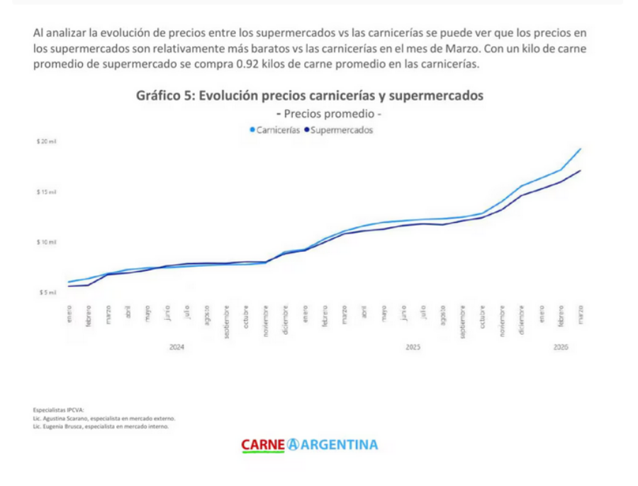 En Diciembre de 2025, los precios en carnicerías superaban los 15.000 pesos por kilo, en tanto que los supermercados alcanzaban aproximadamente 14.000 pesos por kilo. En los primeros meses de 2026, el incremento se aceleró. En Marzo de 2026, el precio promedio de la carne en carnicerías supera los 20.000 pesos por kilo, mientras que en supermercados se ubica cerca de los 18.500 pesos. Entre los cortes, las mayores subas se dieron en la picada común (20,4%), la carnaza (17,7%) y la falda (13,4%), mientras que otros como el lomo (8,5%) o el matambre (7,6%) tuvieron aumentos más moderados.