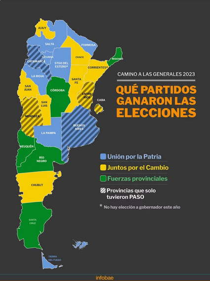 Vale recordar, que en este 2023 las provincias de Corrientes y Santiago del Estero no eligen gobernador. El radical Gustavo Valdés es el mandatario provincial correntino, vinculado a Juntos por el Cambio, mientras que Gerardo Zamora del Frente Cívico por Santiago gobierna la provincia, siendo un aliado de Unión por la Patria. Ambos ejercen esa función desde el año 2021.