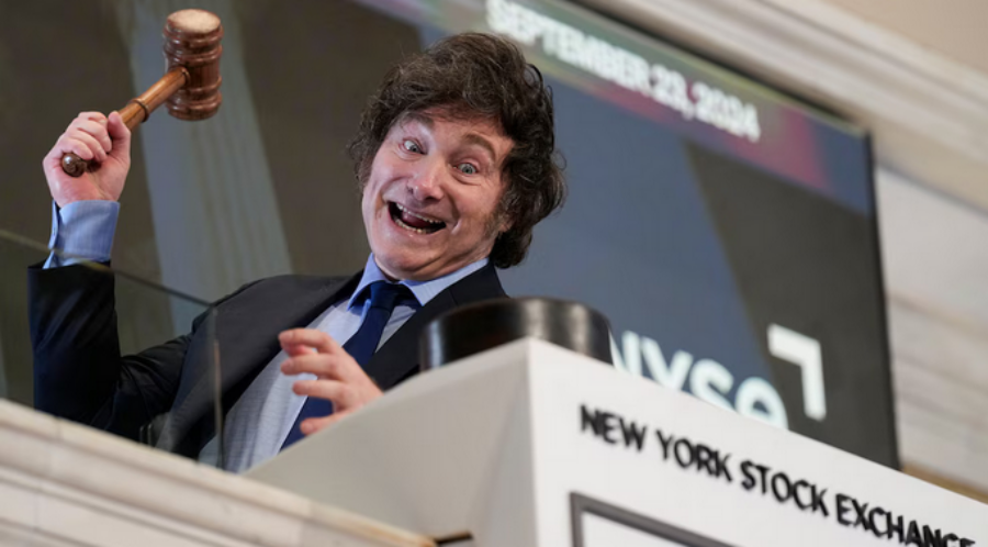 Javier Milei cuando tocó la campana en Wall Street, (New York, Estados Unidos)