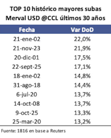 Un análisis de la Consultora 1816 precisó que la ganancia de la Bolsa porteña en dólares para un solo día de operaciones fue la más grande en 30 años, por encima de la rueda del 21 de enero de 2002 (+22%, con la reapertura del mercado de cambios tras la salida de la Convertibilidad), el 21 de noviembre de 2023 (+21,9% con el triunfo electoral de Javier Milei en segunda vuelta) y el 20 de diciembre de 2001 (+17,5%, con la renuncia del entonces ministro de Economía Domingo Cavallo).
