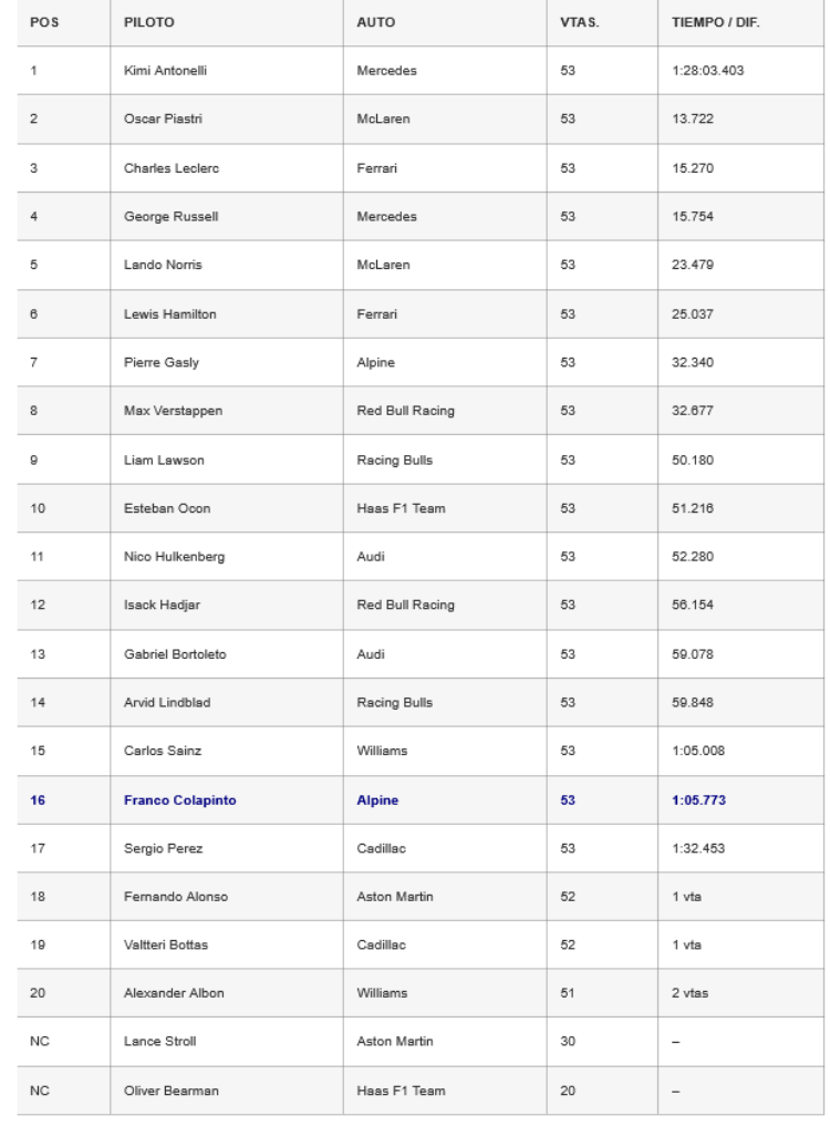 Con 72 puntos, Antonelli lidera el certamen y supera provisionalmente por 7 a Russell. Luego se escalonan Leclerc (a 23) y Hamilton (a 31), y Norris (a 47) con Piastri (a 51), respectivamente. Colapinto ocupa el 15° puesto con 1 punto.