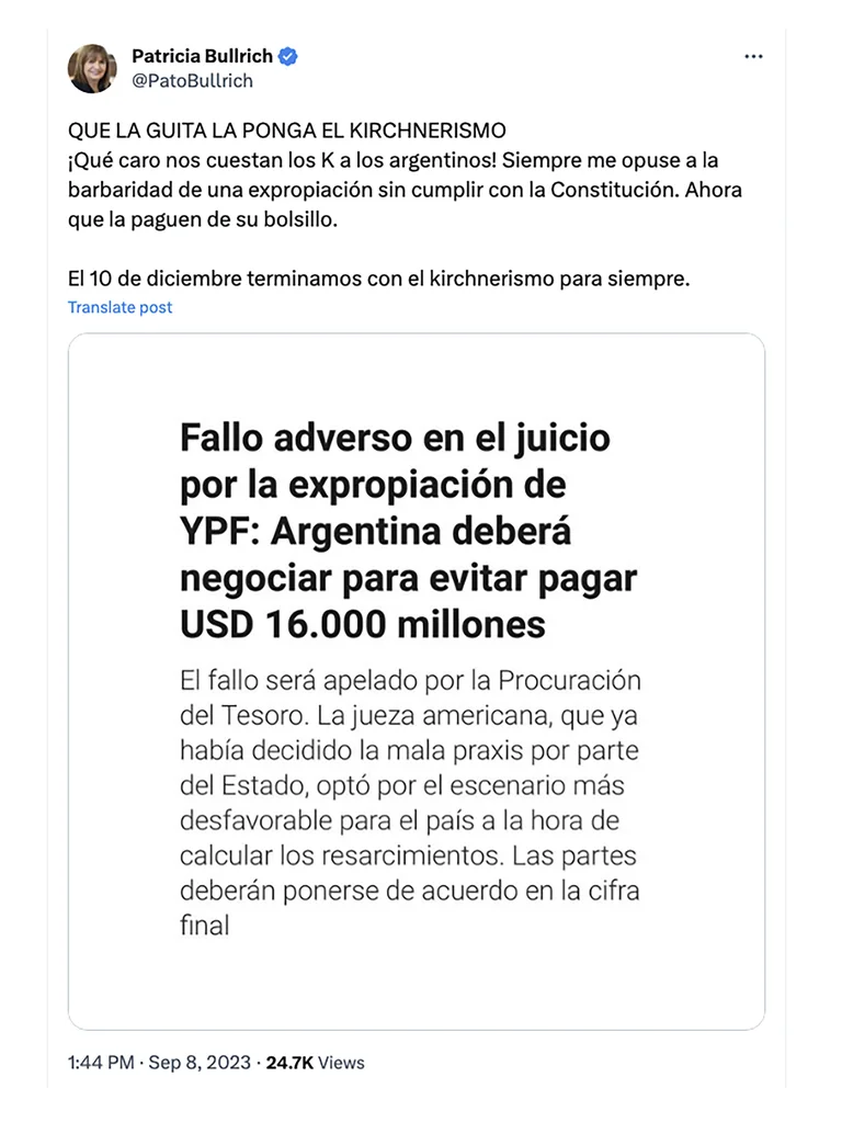 Tras darse a conocer el fallo adverso en el juicio por la expropiación de YPF, donde Argentina deberá negociar para evitar pagar 16.000 millones de dólares; Patricia Bullrich, la candidata a presidenta de Juntos por el Cambio, y otros dirigentes de la oposición criticaron con dureza al gobierno kirchnerista por esa decisión tomada en Abril de 2012.
