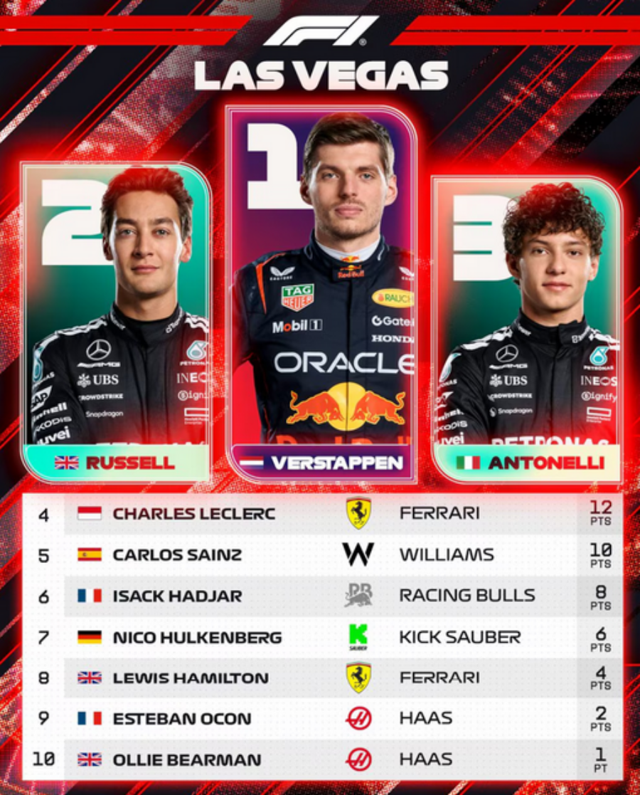 La exclusión de los McLaren provocó una reconfiguración de los resultados en Las Vegas. George Russell ascendió al segundo puesto, logrando así su mejor resultado de la temporada, y Andrea Kimi Antonelli sumó su tercer podio en la Fórmula 1. Charles Leclerc terminó cuarto, Carlos Sainz subió a la quinta posición, e Isack Hadjar, Nico Hulkenberg y Lewis Hamilton también escalaron posiciones. Esteban Ocon y Oliver Bearman ingresaron en el top diez, tras haber finalizado originalmente fuera de los puntos.