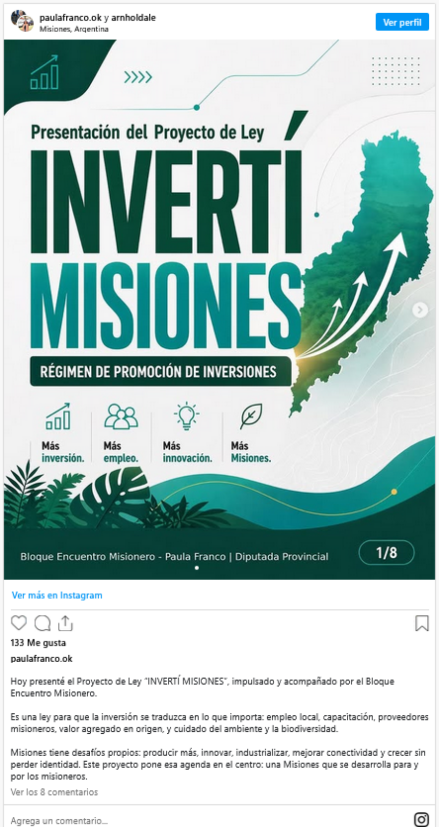 A través de sus redes sociales, Franco sostuvo que la propuesta apunta a que la inversión “se traduzca en lo que importa: empleo local, capacitación, proveedores misioneros, valor agregado en origen y cuidado del ambiente y la biodiversidad”, destacando que Misiones enfrenta desafíos propios vinculados a la producción, la innovación, la industrialización y la mejora de la conectividad.