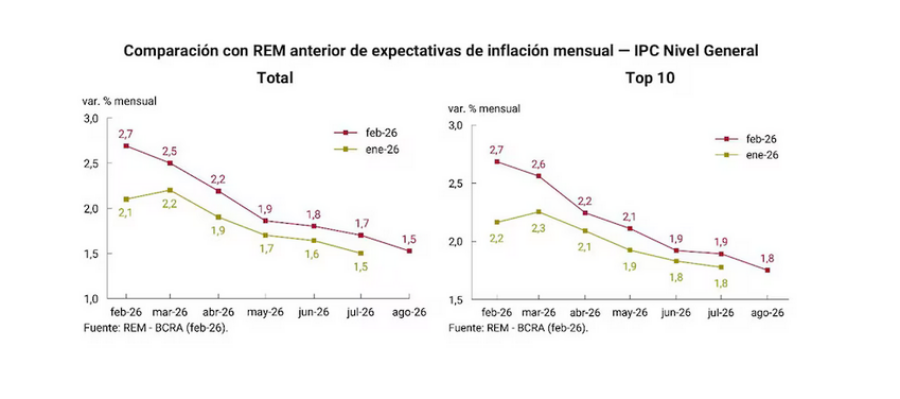 Las expectativas del mercado también se reflejan en el Relevamiento de Expectativas de Mercado (REM) que realiza el Banco Central de la República Argentina (BCRA). El último informe mostró que los analistas y consultoras ajustaron al alza sus proyecciones para febrero: estiman que la inflación de Febrero sería 2,7%, un valor que supera por 0,6 puntos porcentuales el pronóstico que figuraba en la consulta anterior.