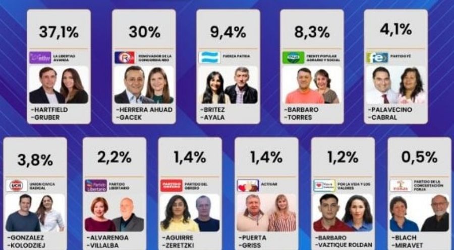 En Misiones votaron en estos comicios 628.261 ciudadanos, lo que representa el 62,43% del padrón. De ese total, 224.362 sufragios fueron para la lista libertaria, 181.561 para la Renovación y 56.779 para Fuerza Patria.