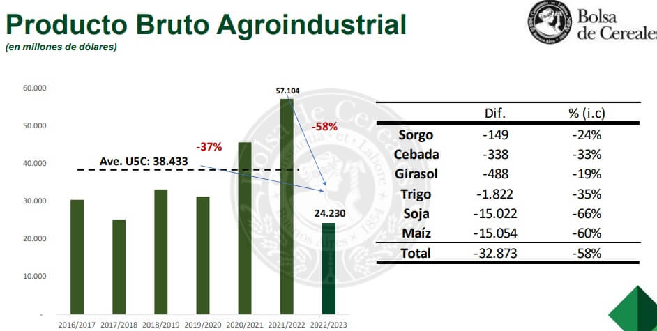La Bolsa de Cereales de Buenos Aires calculó que el producto bruto de la campaña 2022/23 se terminará derrumbando un 58% con respecto al ciclo previo.