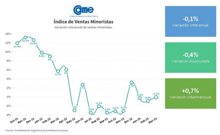 Las ventas minoristas pymes descendieron 0,1% anual en marzo, medidas a precios constantes, y suman así un declive del 0,4% en el primer trimestre del año, frente al mismo periodo de 2022. En la comparación mensual, los comercios vendieron 0,7% más que en Febrero.