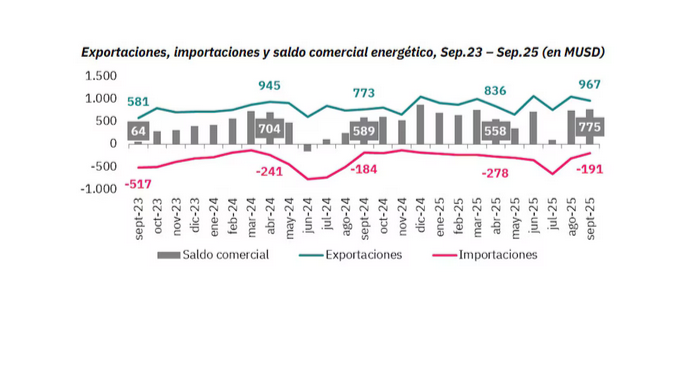 Hasta 2023 la balanza energética acumuló déficits, se revirtió en 2024 y en 2025 podría alcanzar un récord. El reporte detalló: “El sector de combustibles y energía alcanzó en el periodo Enero/Septiembre de 2025 un superávit energético de 5.368 MUSD, con un crecimiento interanual del 45%. Este resultado se debe a un aumento del 13% en las exportaciones y una reducción del 21% en las importaciones. El superávit energético explica casi el 90% del superávit comercial total del país, que fue de 6.030 MUSD”.