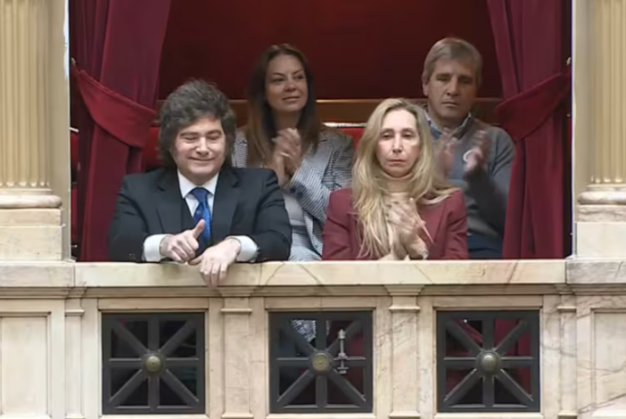 Los hermanos Milei con los Ministros Pettovello (Capital Humano) y Luis Caputo (Economía) en uno de los palcos de Diputados durante la exposición de AdorniCaptura