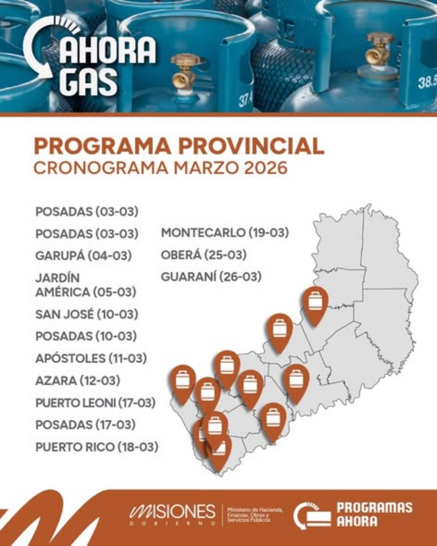 Durante el mes de Marzo, el Ahora Gas recorrerá las ciudades y localidades de; Posadas (3/3); Garupá (4/3); Jardín América (5/3); San José (10/3); Posadas (10/3); Apóstoles (11/3); Azara (12/3); Puerto Leoni (17/3); Posadas (17/3); Puerto Rico (18/3); Montecarlo (19/3); Oberá (25/3) y Guaraní (26/3).