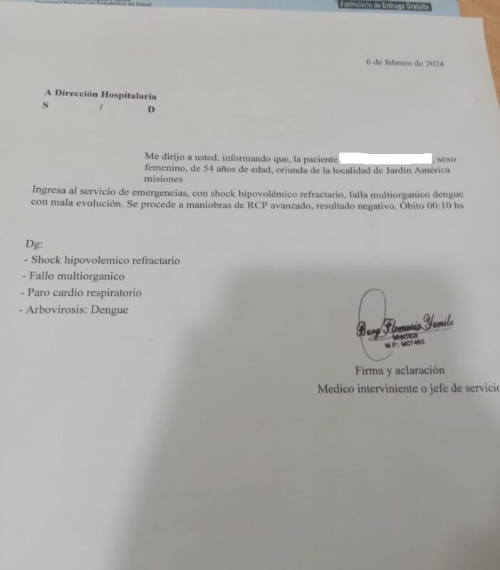 Se trata de una mujer de 54 años que falleció este día martes en el Hospital de la localidad misionera de Jardín América. Se diagnosticó su muerte por un shock hipovolémico refractario, fallo multiorgánico y paro cardiorespiratorio.
