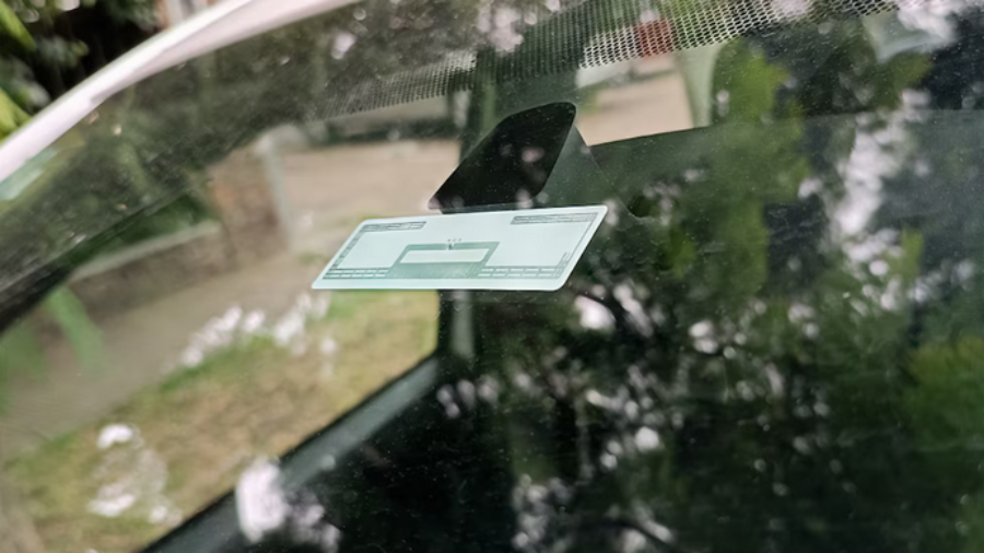 Un dispositivo Telepase, el sticker para el cobro automático de peajes en Argentina, se observa adherido al parabrisas de un vehículo, un sistema digital que simplifica el paso por las cabinas de cobro. (Infobae)