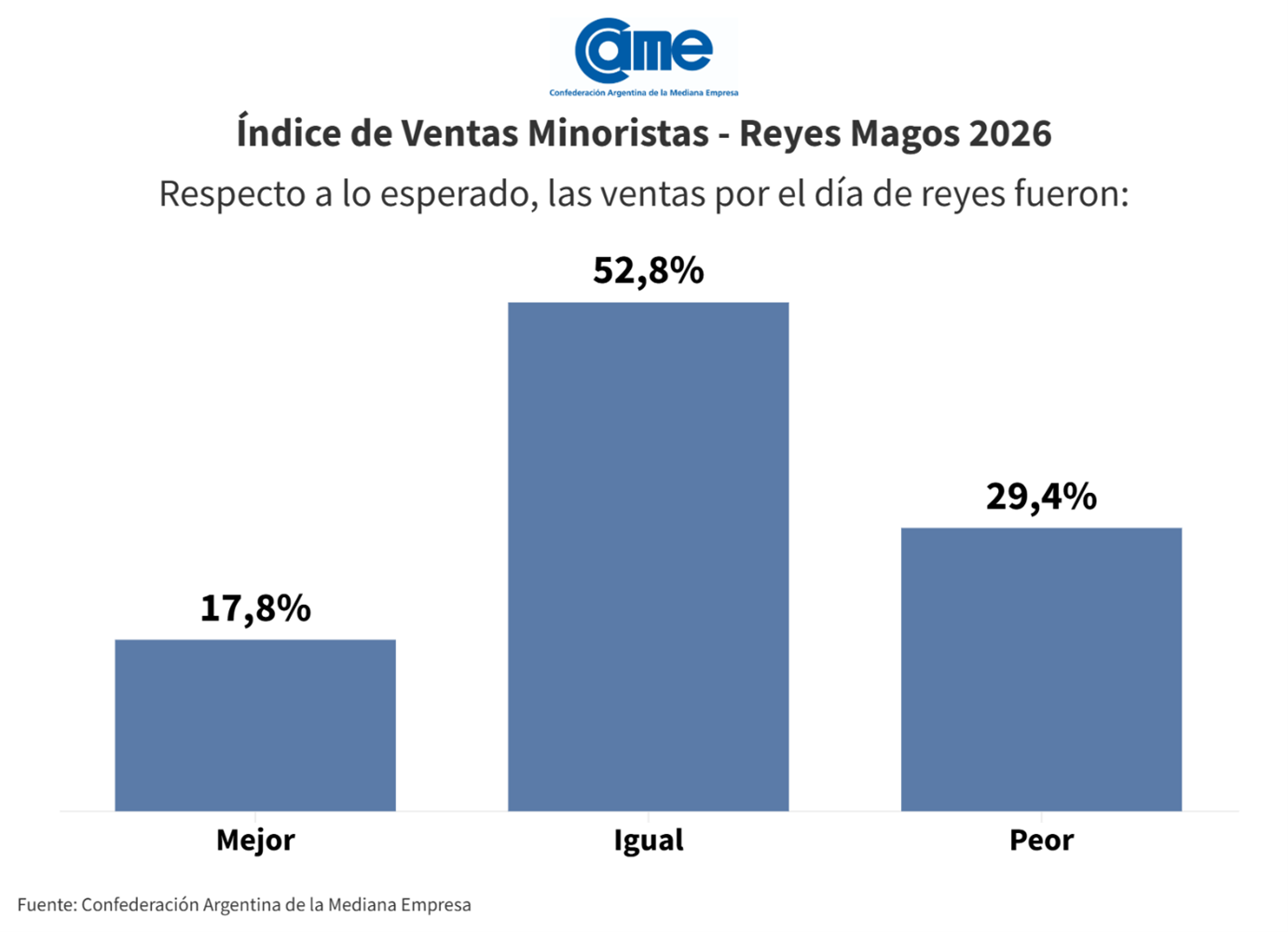 Los datos surgen del relevamiento realizado por la Confederación Argentina de la Mediana Empresa (CAME) entre el 4 y el 5 de Enero de 2026 entre 209 comercios de 30 ciudades del país, incluyendo Ciudad Autónoma de Buenos Aires (CABA) y Gran Buenos Aires, por un equipo conformado por 35 encuestadores.