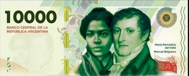 En primer lugar, el billete de 10.000 pesos tendrá las imágenes de Manuel Belgrano y de María Remedios del Valle, heroína de la Guerra de la Independencia, en el anverso. La imagen que se utilizará de Belgrano es de un retrato que se le atribuye al artista francés François Casimir Carbonnier.