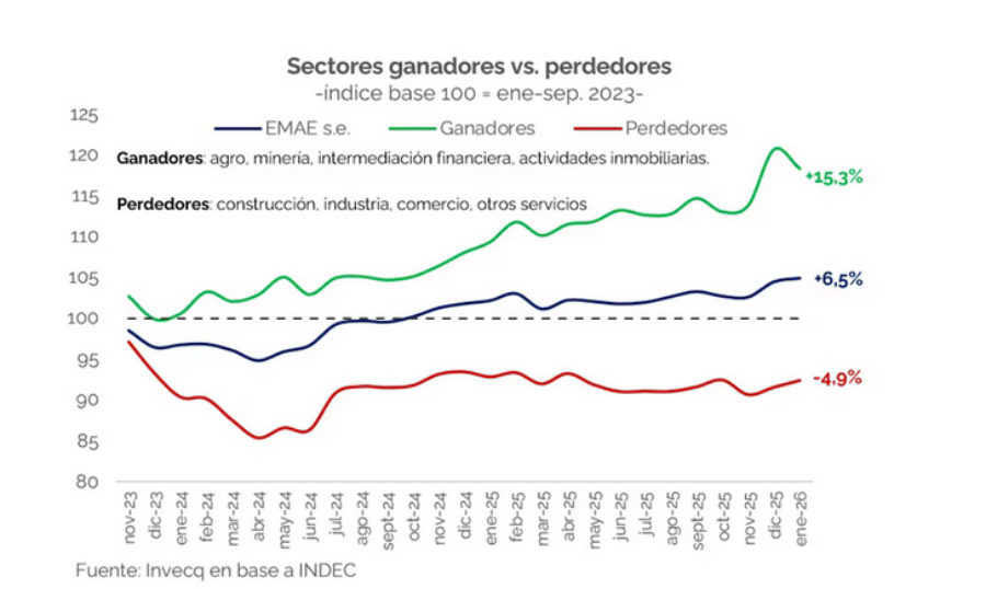 “De esta forma, vemos que en enero los sectores ganadores cayeron, pero se mantienen 15,3% arriba respecto al nivel de noviembre de 2023, mientras que los perdedores tuvieron una mejora, pero continúan 4,9% por debajo del nivel del inicio del Gobierno, y se encuentran estancados desde Junio de 2025″, destacaron.