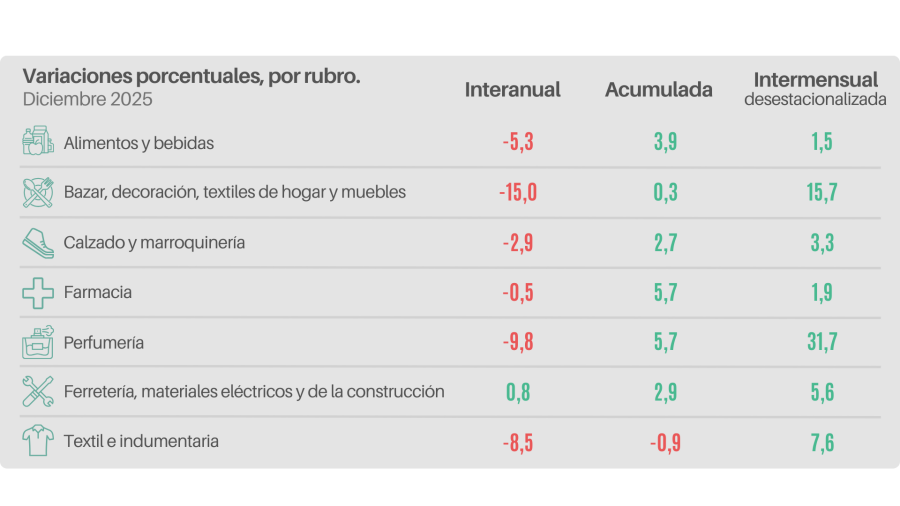 El análisis sectorial confirma la tendencia recesiva reciente: seis de los siete rubros relevados finalizaron con números rojos. Las contracciones más agudas se verificaron en Bazar y decoración (-15%), Perfumería (-9,8%) y Textil e indumentaria (-8,5%). La única excepción a la regla fue el rubro Ferretería, materiales eléctricos y de la construcción, que logró sostenerse con una leve alza del 0,8%.