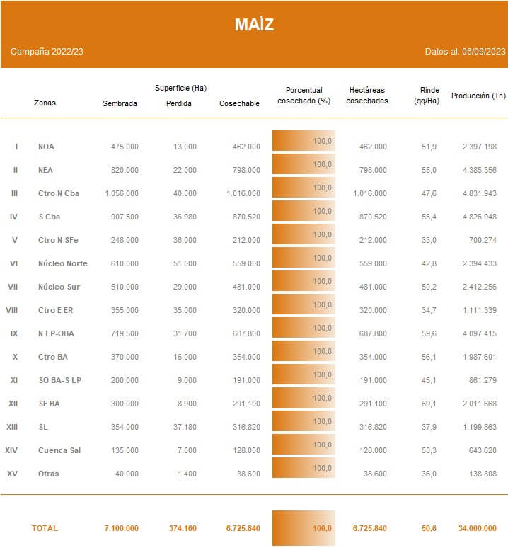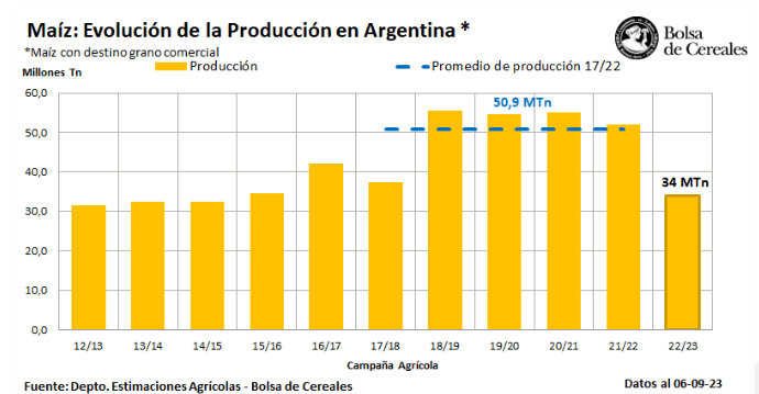 La Bolsa de Cereales de Buenos Aires dio por finalizada la cosecha de maíz 2022/23, con una estimación de producción de 34 millones de toneladas, lo que significa una caída del 35% en relación al año pasado, cuando fueron 52 millones.
