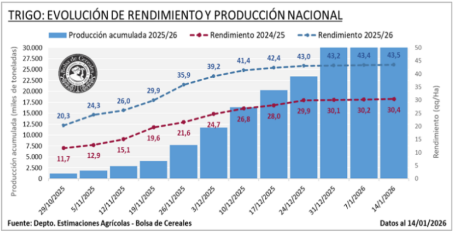 La Bolsa de Cereales de Buenos Aires dio por finalizada la recolección del cereal y estimó un rendimiento promedio nacional superlativo: 43,5 qq/ha, un 50,4% por encima del promedio de las últimas cinco campañas.