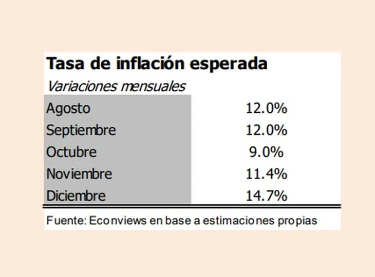 "Desde Econviews proyectamos que la inflación general será alrededor del 12% en Agosto y en Septiembre. La estrategia del Banco Central de anticipar la devaluación de los próximos 60 días hace que la inflación se ubique en un escalón más arriba. En un contexto de incertidumbre política y poca credibilidad en la conducción actual, el congelamiento de precios y la utilización del tipo de cambio oficial como ancla nominal, no son suficientes.