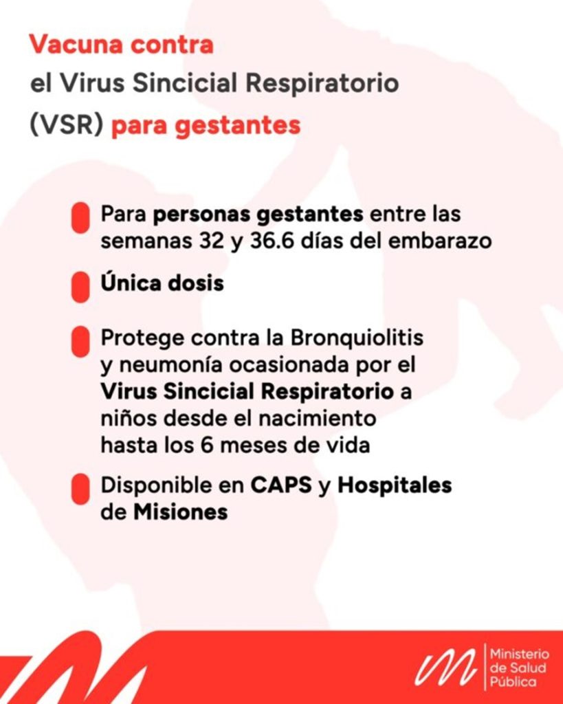 La provincia de Misiones inicia este lunes 4 de marzo la estrategia de vacunación contra el Virus Sincicial Respiratorio (VSR) para personas gestantes en los Centros de Atención Primaria y Hospitales de la provincia, a través del Ministerio de Salud Pública.