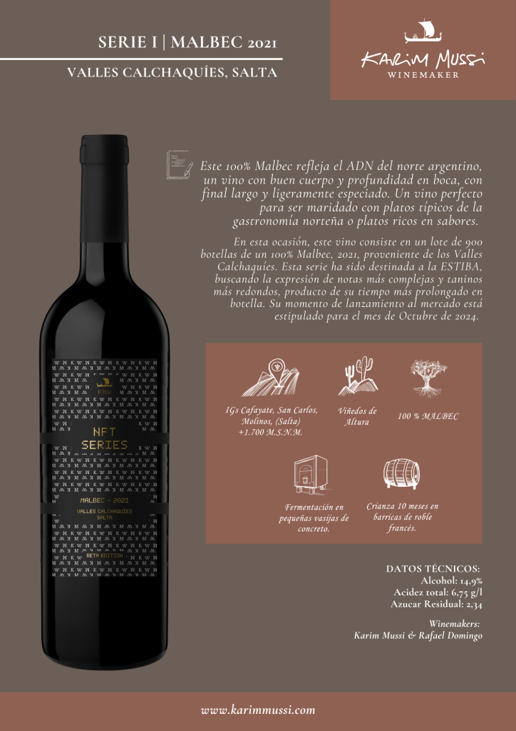 NFT Series es un vino 100% Malbec, 2021, proveniente de los Valles Calchaquíes, que es parte de un lote de 900 botellas que han sido destinadas a una estiba más prolongada, buscando la expresión de notas más complejas y taninos más redondos.