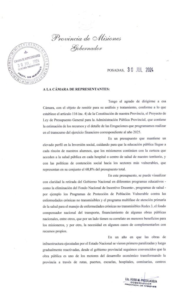 "Ayer el Gobernador Hugo Passalacqua envió a la Cámara de Representantes para su análisis, tratamiento y votación el Proyecto de Ley de Presupuesto General para la Administración Pública Provincial correspondiente al año 2025, documento que estima los recursos y erogaciones previstas para el año próximo y totaliza la suma de 3.107.874.111.000 pesos, monto que expresa los gastos programados para el ejercicio financiero 2025".
