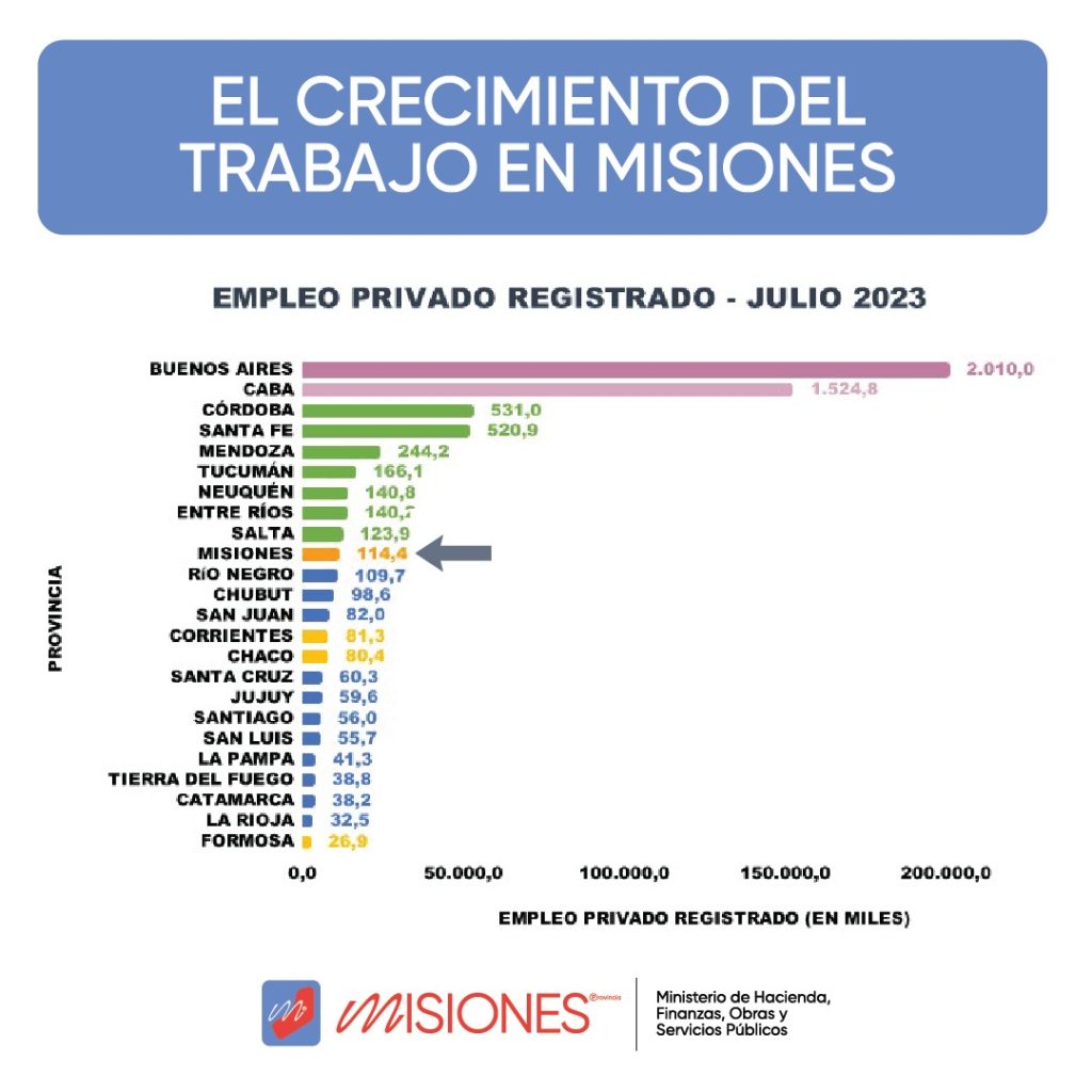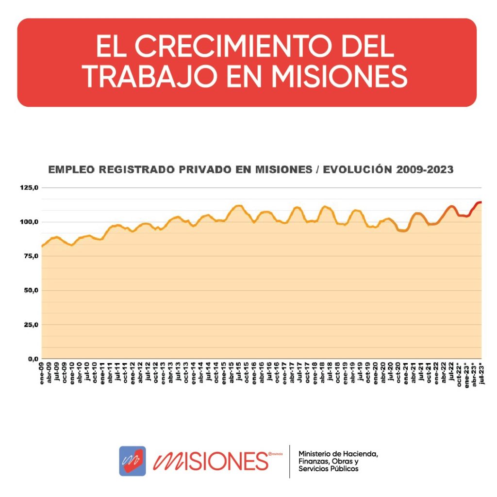 "Tras crear 2.754 empleos registrados entre Julio de 2022 y Julio de 2023, la economía de Misiones alcanzó los 114.388 trabajadores en blanco en el sector privado, superando el récord previo, que databa de 2015; y logrando así el número más alto de trabajadores en la historia de la Provincia".