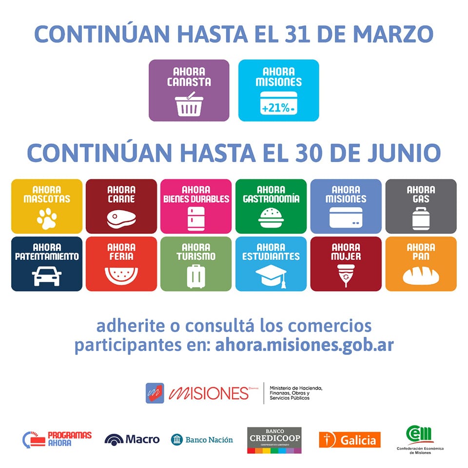 Días atrás el Gobernador de al provincia de Misiones, Oscar Herrera Ahuad anunció que hasta el 30 de Junio de este año seguirán vigentes los programas Ahora Misiones, Ahora Bienes Durables, Ahora Mujer, Ahora Estudiantes, Ahora Carne, Ahora Gastronomía, Ahora Feria, Ahora Turismo, Ahora Patentamiento y Ahora Mascotas.
