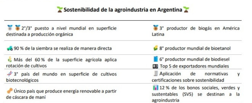 En concreto, la Bolsa cordobesa hizo una recopilación con una decena de datos concretos que reflejan el lugar preponderante que ocupa la Argentina respecto a su sostenibilidad agroindustrial.