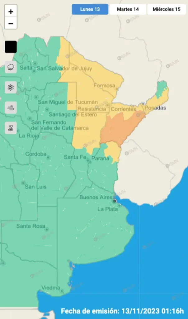 Se trata de un alerta amarillo para zonas de Entre Ríos, Corrientes, Misiones, Santa Fe, Santiago del Estero, Chaco, Formosa y Salta. En algunas regiones de Corrientes el aviso sube a naranja.