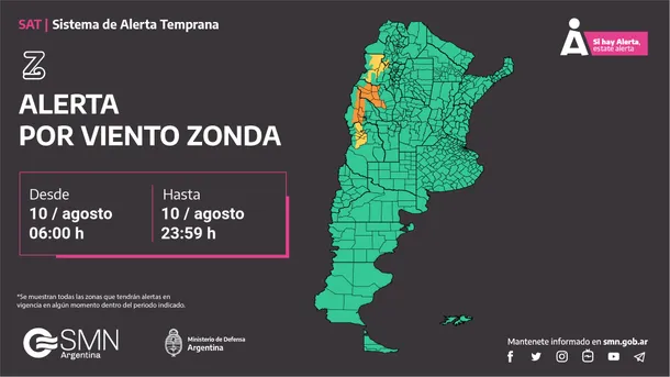 Estas áreas serán afectadas por viento Zonda, con intensidades entre 40 y 60 kilómetros por hora, con ráfagas que pueden superar los 85 kilómetros por hora, según el SMN.
