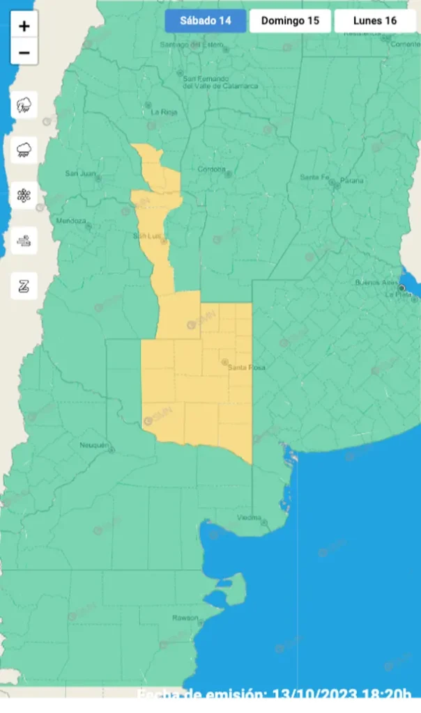 Se trata de un alerta amarillo por vientos que rige este sábado para zonas de La Pampa, San Luis y La Rioja.