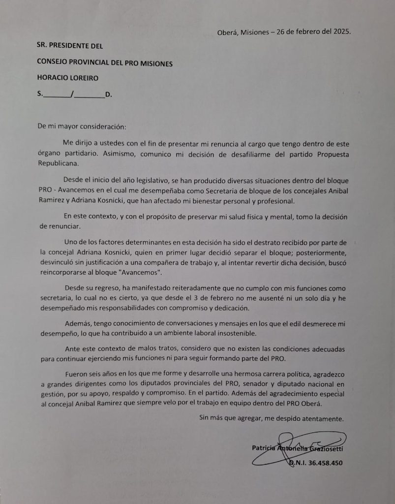 Antonella Graziosetti : “Ante de este contexto de malos tratos, considero que no existen las condiciones adecuadas para continuar ejerciendo mis funciones ni seguir formando parte del PRO Misiones”