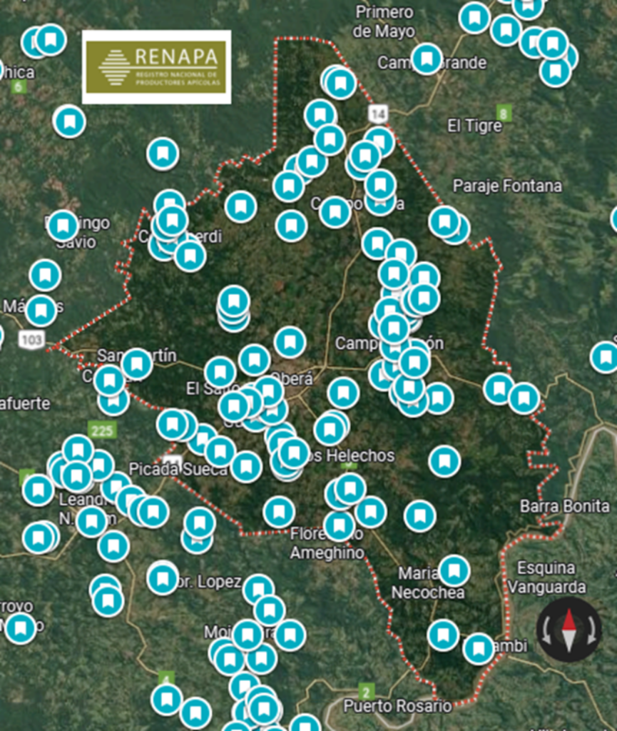 Durante la jornada, la Dirección de Investigaciones del Ministerio del Agro y la Producción puso en conocimiento la situación actual del departamento, a partir de datos sistematizados en el Registro Nacional del Productor Apícola. En este sentido, se georreferenció y graficó la distribución de los apiarios para dimensionar la actividad y orientar las intervenciones.
