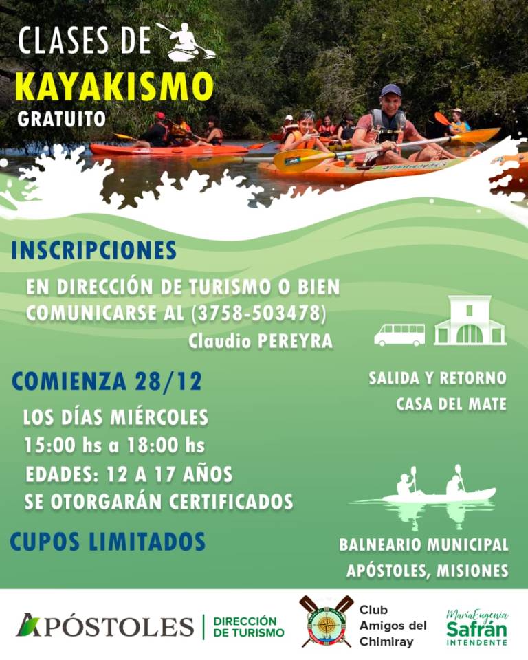 La Dirección de Turismo de la Municipalidad de la ciudad misionera de Apóstoles juntamente con el Club Amigos del Chimiray invitan a todos los interesados en tomar clases de kayakismo gratuito a acercarse a la Dirección de Turismo o comunicarse con Claudio Pereyra al teléfono 3758-503478, las mismas comienzan el día 28 de Diciembre del corriente y se dictarán los miércoles de 15,00 a 18,00 horas para personas entre 12 a 17 años de edad.