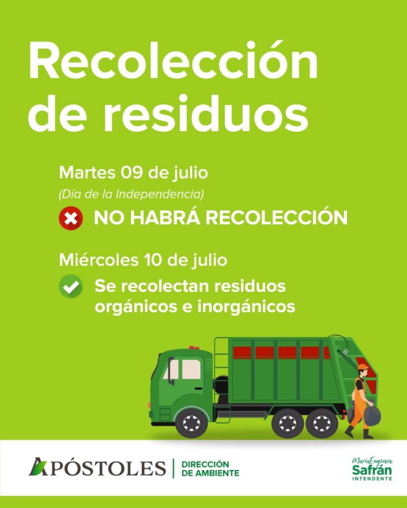 La Municipalidad de la ciudad misionera de Apóstoles a través de la Dirección de Medio Ambiente informa a la comunidad que el día martes 9 de Julio, no habrá recolección de residuos domiciliarios debido al Día de la Independencia.