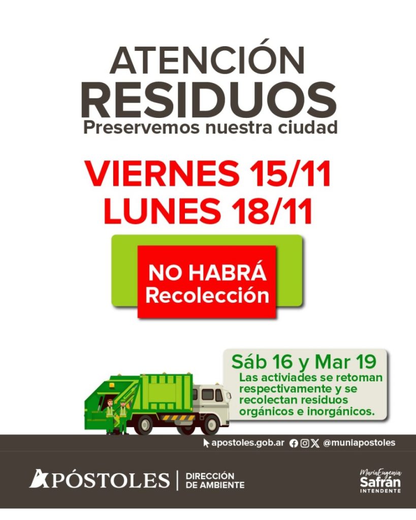 La Municipalidad de la ciudad misionera de Apóstoles a través de la Dirección de Industria comunica que el viernes 15 y el lunes 18 de Noviembre, no habrá recolección de residuos domiciliarios por esquema fin de semana largo.