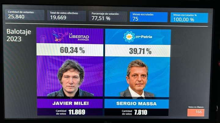 Javier Milei con La libertad Avanza (LLA), 11.869 votos. 60,34%Sergio Massa de Unión por la Patria (UxP) 7.810 votos. 39,71%Estaban 25.840 ciudadanos habilitados a sufragar.Votaron. - 19.669 personas.Porcentaje de votación. - 77,51%.