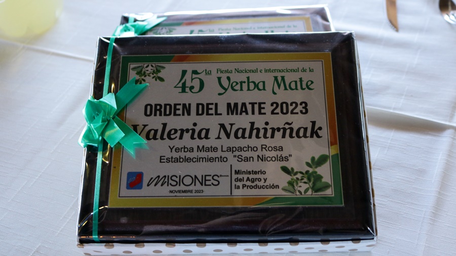 Por cuarto año consecutivo, la Orden del Mate es otorgada a mujeres de la ruralidad. En el marco de la 45° Fiesta Nacional e Internacional de la Yerba Mate el reconocimiento fue recibido por Valeria Nahirñak, propietaria y gerenta del establecimiento San Nicolás elaborador de la Yerba mate “Lapacho Rosa”. El establecimiento fue fundado hace 45 años, y desde entonces su crecimiento ha sido progresivo contando actualmente con 10 hectáreas de yerba y produciendo 2000 kilos mensuales de yerba molida. Valeria lidera el secadero hace 18 años y desde hace un tiempo tiene un manejo de sus yerbales de forma agroecológica, además de prestar servicios de secansa a terceros y recibir visitas turísticas.