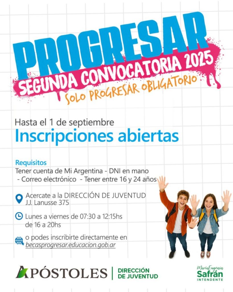 La Dirección de la Juventud de la Municipalidad de la ciudad misionera de Apóstoles informa a todos los interesados sobre la segunda convocatoria del Programa Progresar 2025, que las inscripciones se extienden hasta el día 1° de Septiembre, (solo Progresar Obligatorio).