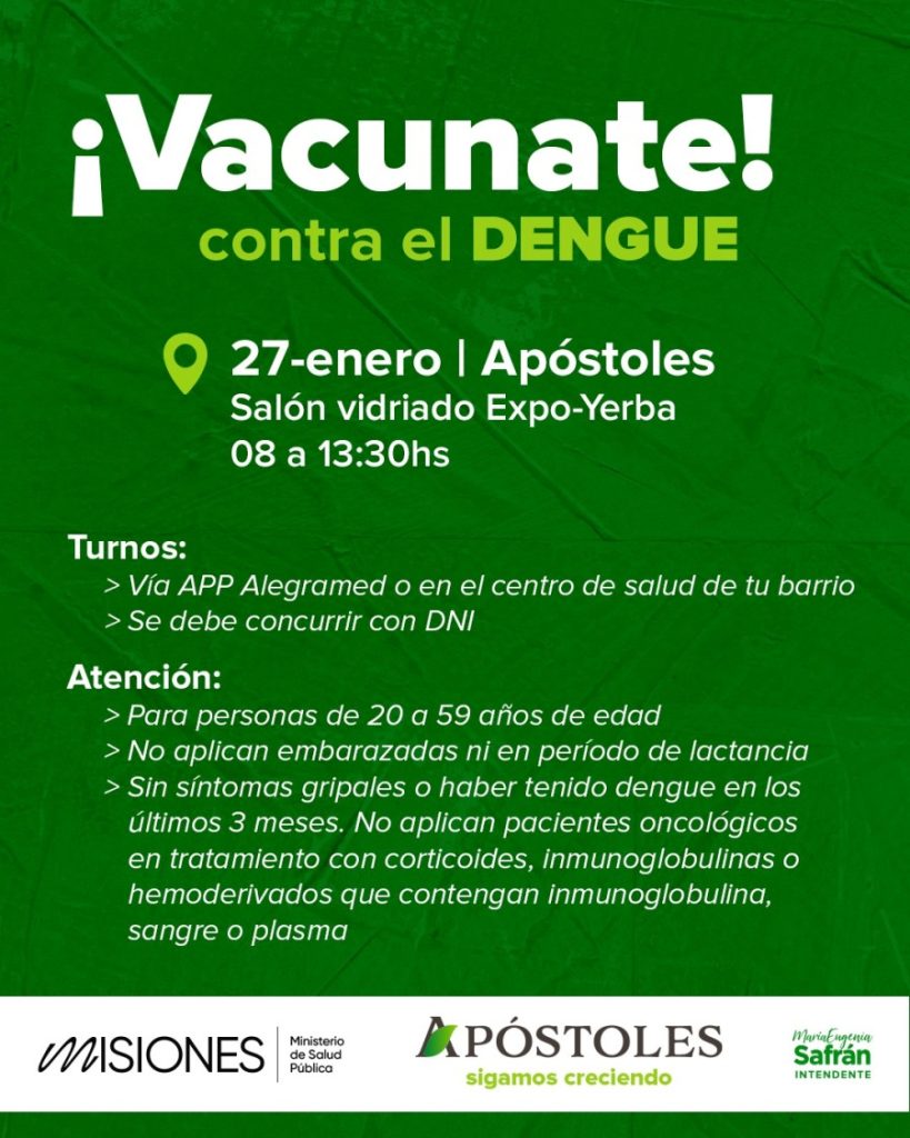 El Ministerio de Salud Pública de la provincia de Misiones, en colaboración con las autoridades sanitarias de la ciudad de Apóstoles, anuncia la realización de una campaña de vacunación contra el Dengue, con el objetivo de proteger a la población contra esta enfermedad viral.